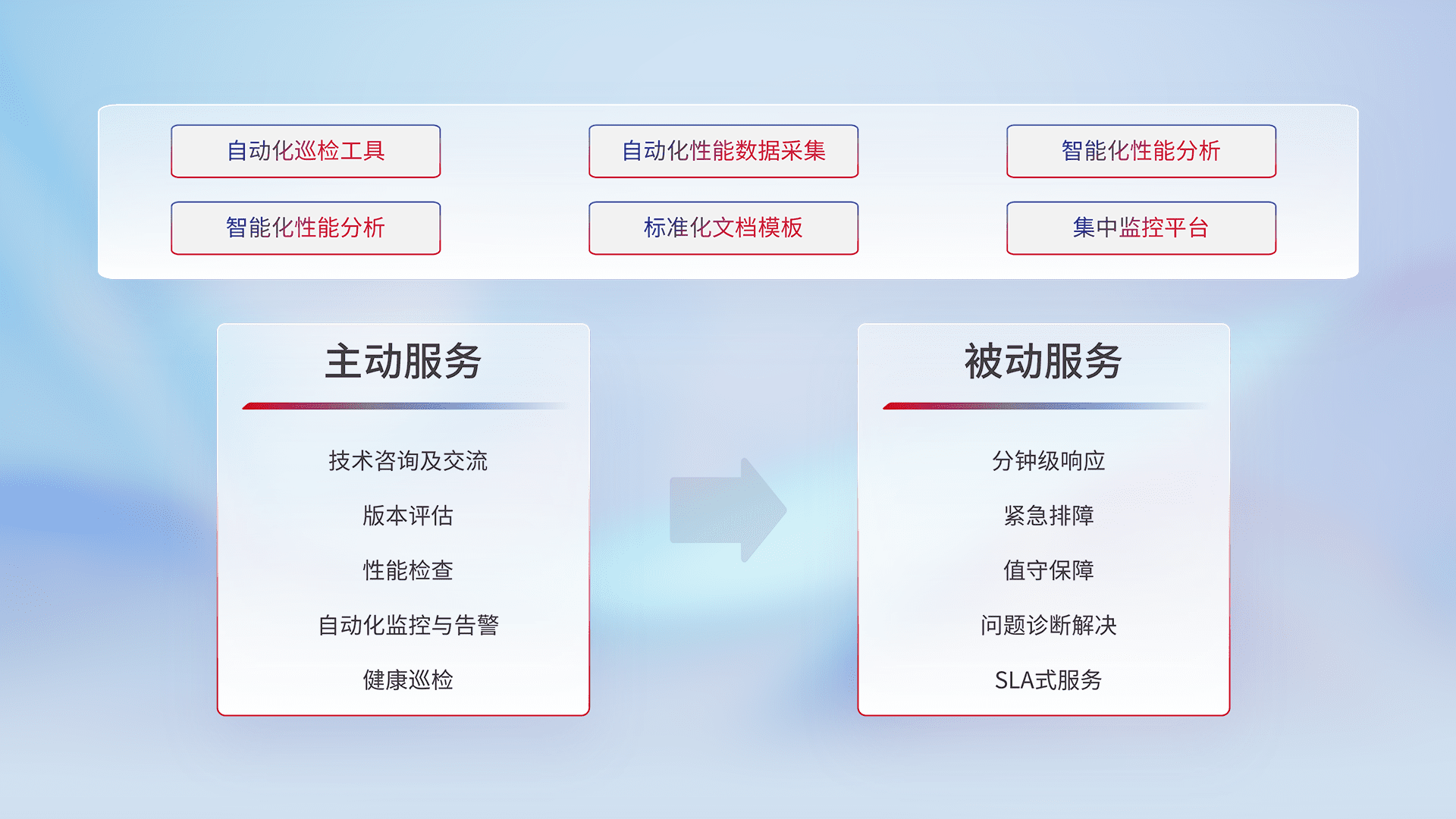 智能化工具和标准化文档,,,保障服务质量,,,提供主动服务(包含技术咨询、、版本评估、、性能检查、、自动化监控与告警、、健康巡检)和被动服务包含(分钟级响应、、、紧急排障、、值守保障、、、问题诊断解决、、SLA服务)。。。。